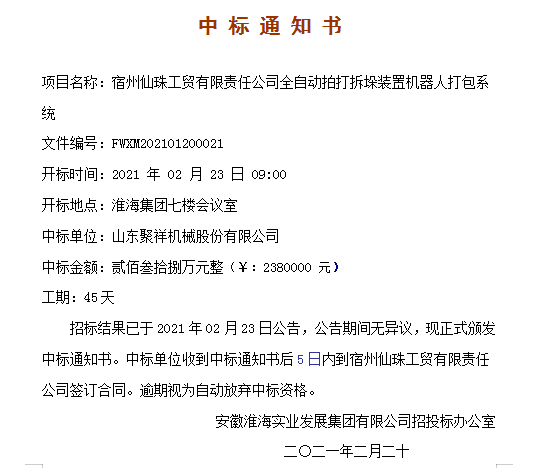聚祥打包機招標成功